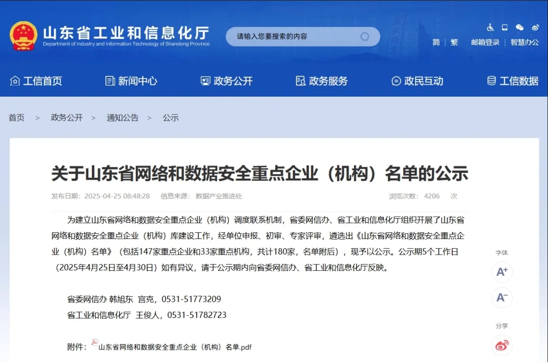 近日,在省委網(wǎng)信辦、省工業(yè)和信息化廳聯(lián)合開展的山東省網(wǎng)絡(luò)和數(shù)據(jù)安全重點(diǎn)企業(yè)(機(jī)構(gòu))庫建設(shè)工